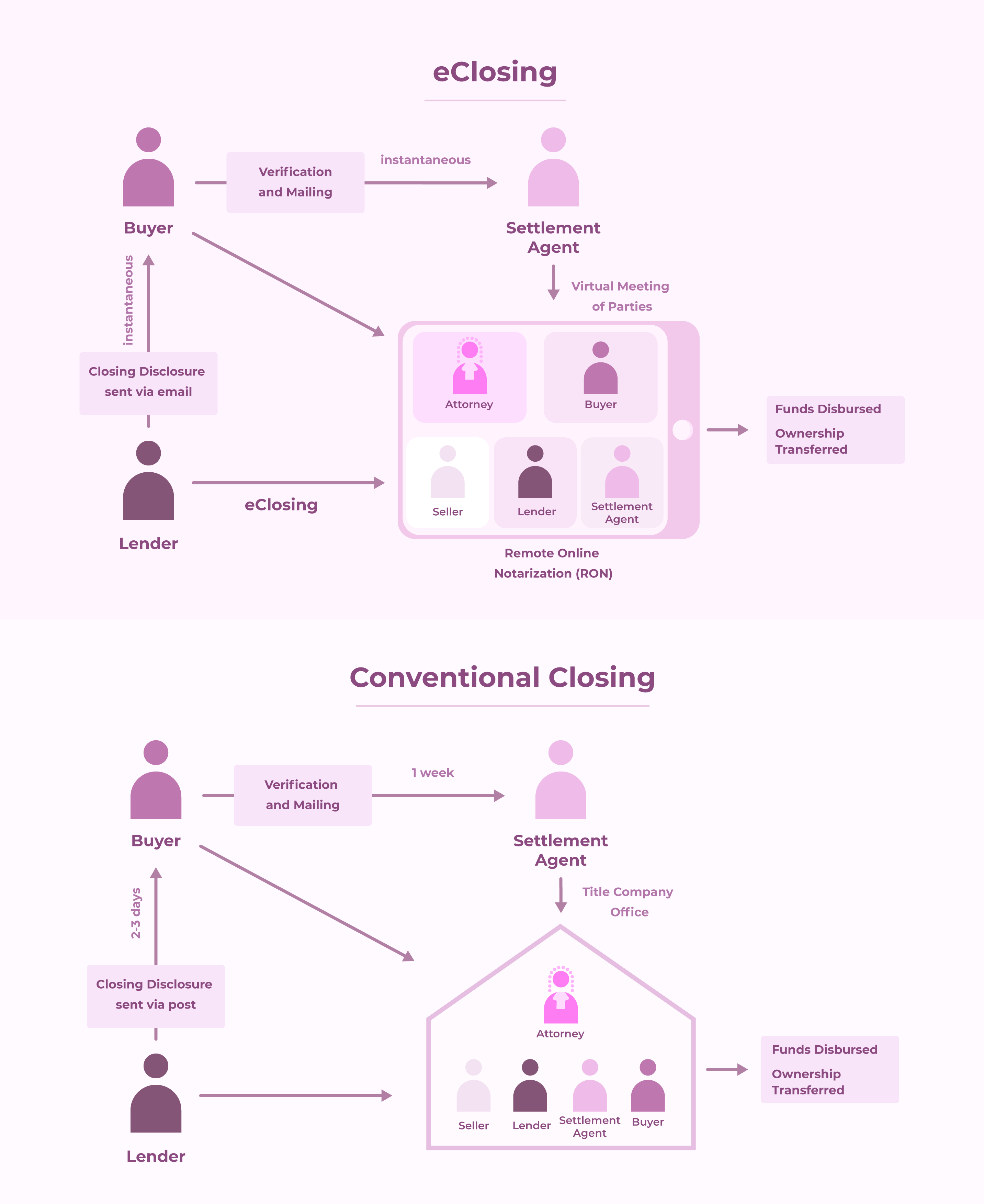 The documents required from the buyer and the seller are already electronically signed and verified by the lender. The consent of the parties is then taken into account by the attorney. The attorney then affixes the electronic seal of the title company on the deed. Once the seal is applied and the record is made, the funds are disbursed to the seller’s account and the buyer assumes the legal ownership of the property.