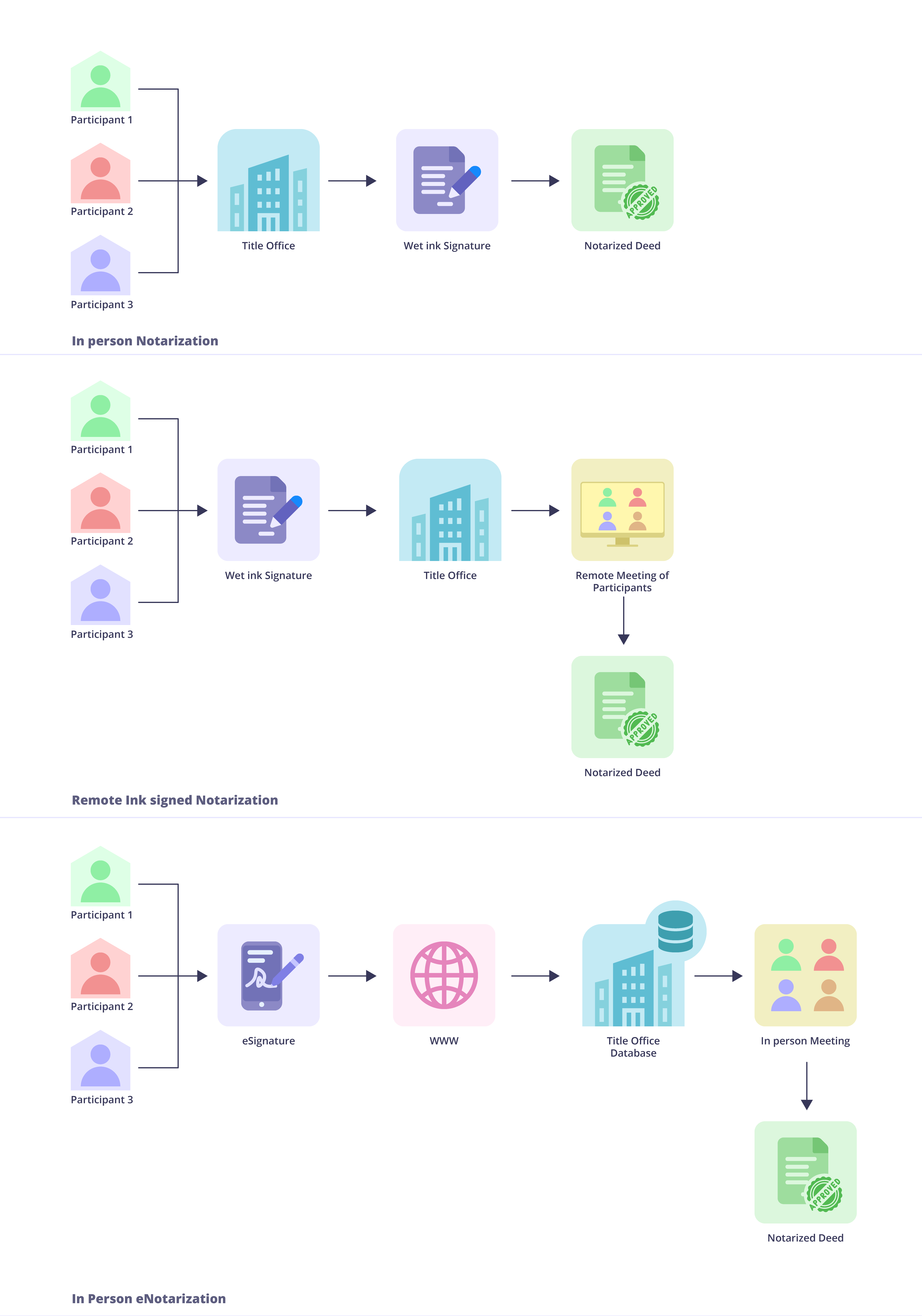In person Notarization. The conventional notarization process where all parties meet in person at the notary office to sing the documents with wet ink signatures. Many title companies still use this method that is attributed to a multitude of factors.