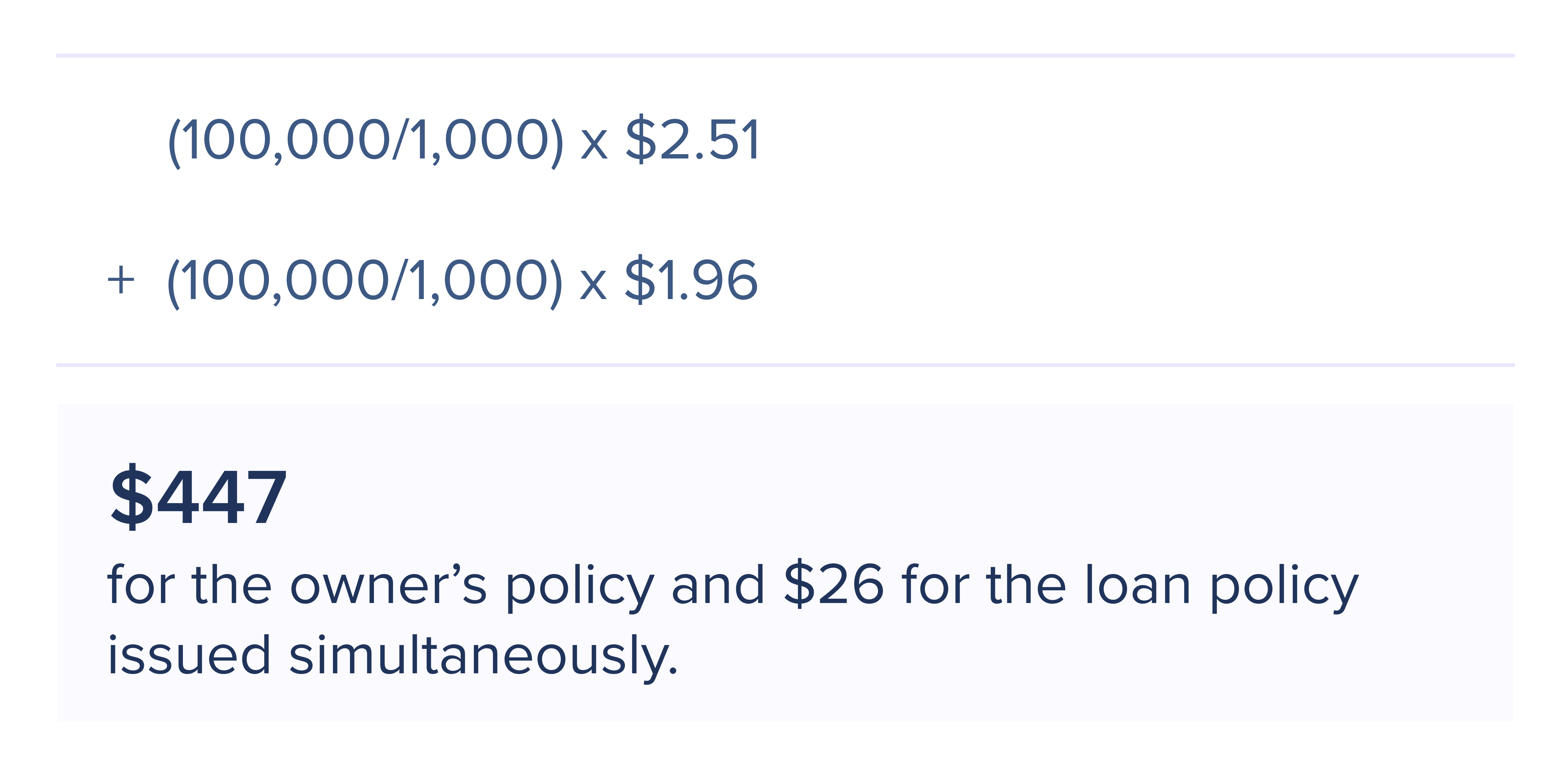 A property of $200,000 will cost you $447 for an owner's policy. On the other hand, a flat $26 is charged for the lender's policy on each mortgage, bringing up the total to $473.